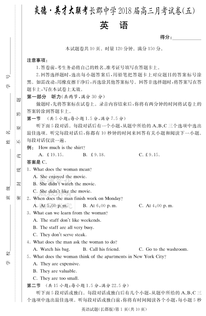 【英語】炎德英才大聯(lián)考2018長郡中學(xué)高三5次月考