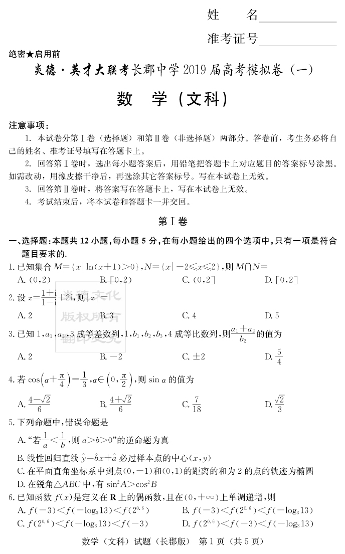 【文數(shù)】炎德英才大聯(lián)考2019長(zhǎng)郡中學(xué)高三9次月考(模擬一)