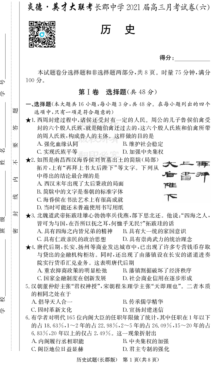2026名師導學·高考總復習·小題量基礎周周考·歷史