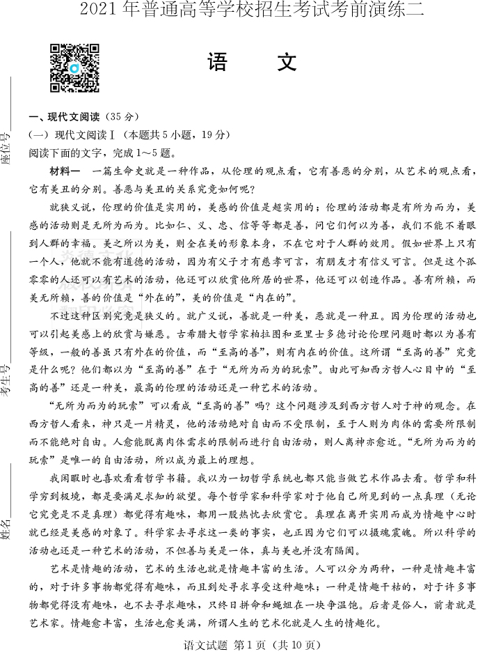 上一篇:【英語】2021年普通高等學校招生全國統一考試考前演練(二)
